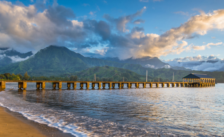 This two-mile crescent-shaped swath of coastline on the North Shore, where the Hanalei River meets the Pacific Ocean. The beach, stretching along Kauaʻi's largest bay, is made up of several parks.
